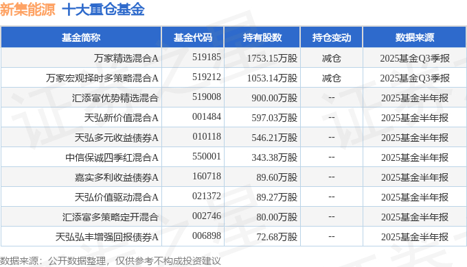 持有新集能源最多的基金为万家精选混合A,目前规模为10.85亿元,最新净值1.8039(10月24日),较上一交易日下跌0.8%,近一年下跌2.29%。该基金现任基金经理为黄海。