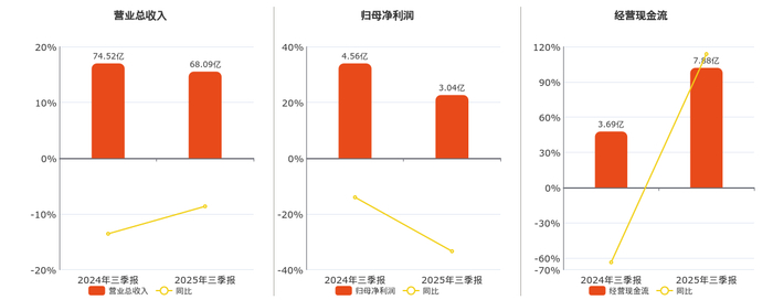 公司营业总收入为68.09亿元,在已披露的同业公司中排名第1,较去年同报告期营业总收入减少6.43亿元,同比较去年同期下降8.63%。归母净利润为3.04亿元,在已披露的同业公司中排名第3,较去年同报告期归母净利润减少1.52亿元,同比较去年同期下降33.37%。经营活动现金净流入为7.88亿元,在已披露的同业公司中排名第2,较去年同报告期经营活动现金净流入增加4.19亿元,同比较去年同期上涨113.73%。