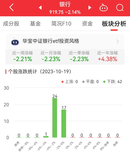 中国经济网北京10月19日讯今日,银行板块整体跌幅2.14%,其中42只股票均下跌。