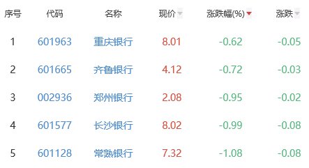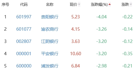 贵阳银行、渝农商行、江阴银行、平安银行、浦发银行位列涨幅榜后五位,涨幅分别为-4.04%、-3.26%、-3.20%、-3.20%、-2.98%。