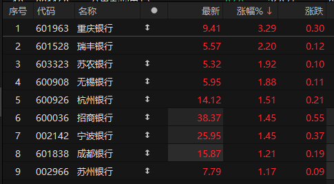 上证报中国证券网讯 11月14日午后,银行板块逆势走强,截至13时32分,重庆银行涨逾3%,瑞丰银行涨超2%,苏农银行、无锡银行、杭州银行、招商银行、成都银行等多股涨超1%。