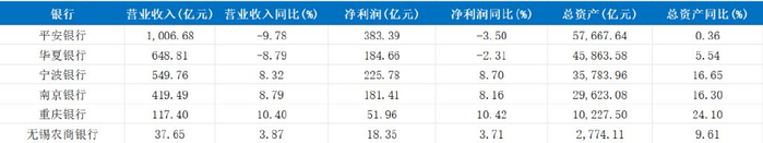 数据显示,两家股份行——平安银行和华夏银行,继续延续了营收与净利润的“双降”态势;而三家城商行及无锡农商行则继续保持稳健增长,资产规模不断扩大。