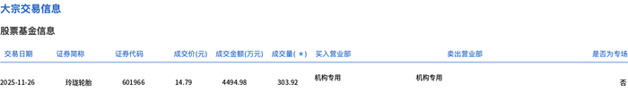 玲珑轮胎今日大宗交易平价成交303.92万股,成交额4494.98万元