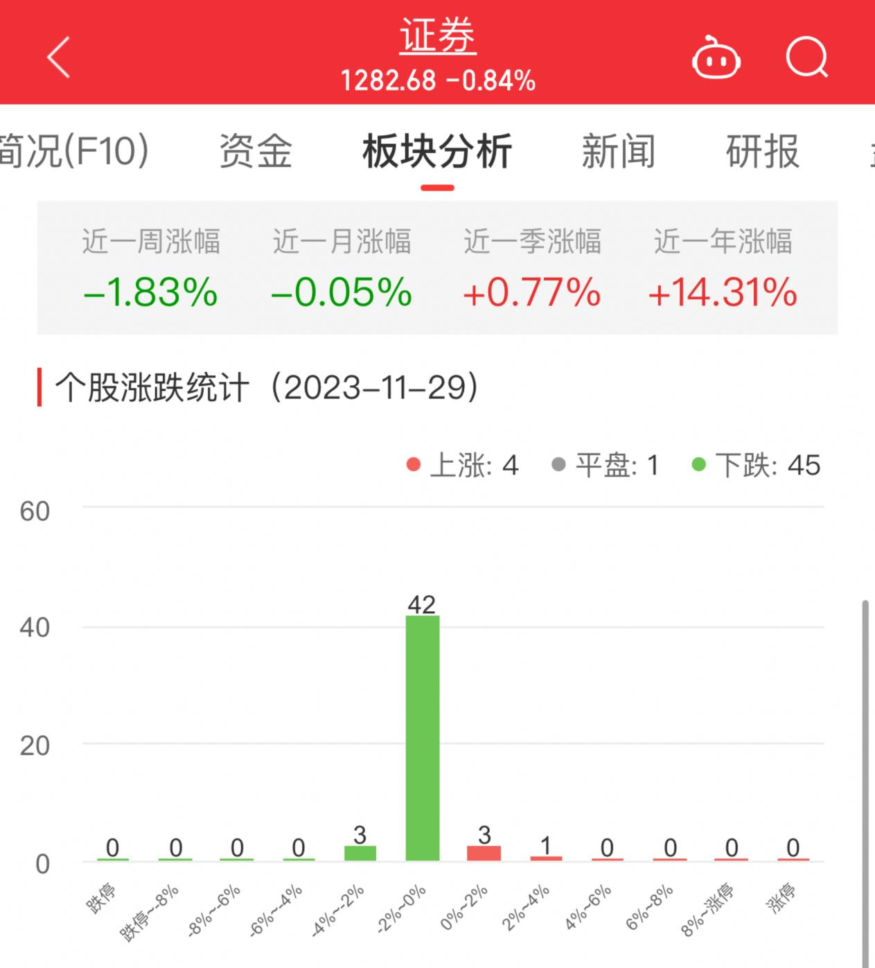 中国经济网北京11月29日讯 今日,证券板块整体跌幅0.84%,其中4只股票上涨,1只股票平盘,45只股票下跌。