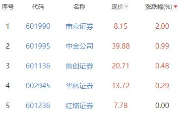 其中,南京证券、中金公司、首创证券、华林证券、红塔证券位列板块涨幅前五位,涨幅分别为2.00%、0.99%、0.48%、0.29%、0.00%。