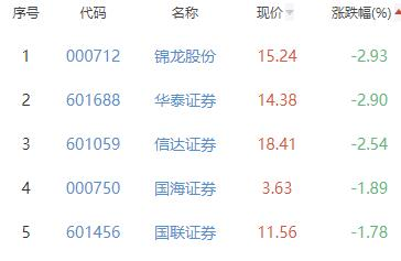 锦龙股份、华泰证券、信达证券、国海证券、国联证券位列涨幅榜后五位,涨幅分别为-2.93%、-2.90%、-2.54%、-1.89%、-1.78%。