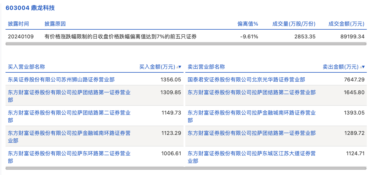 1月9日,鼎龙科技今日跌9.41%,龙虎榜数据显示,上榜营业部席位全天成交1.9亿元,占当日总成交金额比例为21.35%。其中,买入金额为5945.52万元,卖出金额为1.31亿元,合计净卖出7155.04万元。