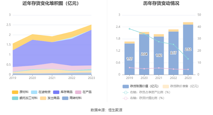 从存货变动来看,截至2023年年末,公司存货账面价值为2.51亿元,占净资产的13.26%,较上年末增加3473.81万元。其中,存货跌价准备为1179.25万元,计提比例为4.48%。