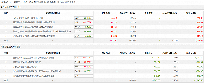 具体来看,知名游资现身龙虎榜,宁波桑田路(国盛证券有限责任公司宁波桑田路证券营业部)净买入594.27万元。此外,东莞证券四川分公司、银泰证券无锡兴源北路证券营业部分别买入774.33万元、603.28万元;银泰证券无锡兴源北路证券营业部、国泰君安证券总部分别卖出1099.70万元、981.01万元。