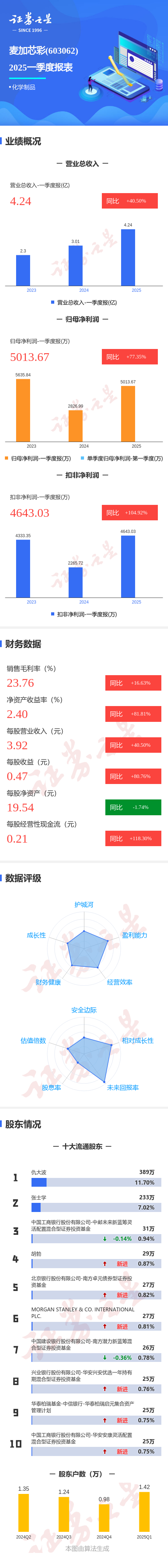 图解麦加芯彩一季报:第一季度单季净利润同比增77.35%