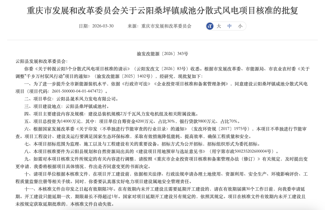 3月30日,重庆市发展和改革委员会核准5个分散式风电项目,总装机容量达10万千瓦。
