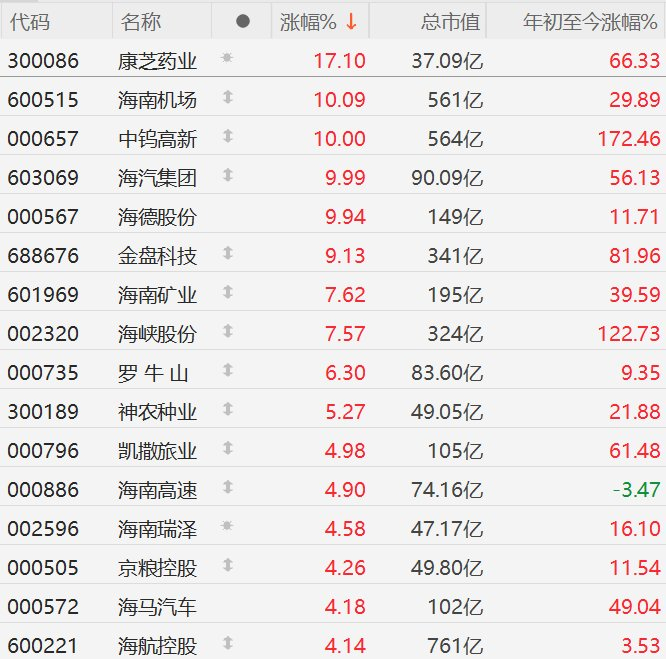 格隆汇10月29日|A股市场海南板块集体上涨,截至半日收盘,康芝药业涨超17%,海南机场、中钨高新、海汽集团、海德股份10CM涨停,金盘科技涨超9%,海南矿业、海峡股份涨超7%,罗牛山涨超6%,神农种业涨超5%,凯撒旅业、海南高速、海南瑞泽、京粮控股、海马汽车、海航控股涨超4%。