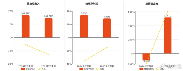 公司营业总收入为269.79亿元,较去年同报告期营业总收入减少39.75亿元,同比较去年同期下降12.84%。归母净利润为4.53亿元,较去年同报告期归母净利润减少8048.16万元,同比较去年同期下降15.10%。经营活动现金净流入为17.81亿元,较去年同报告期经营活动现金净流入增加21.34亿元。