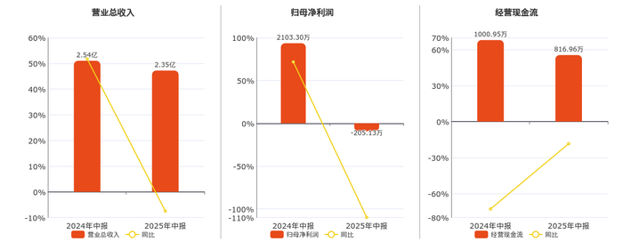 公司营业总收入为2.35亿元,在已披露的同业公司中排名第11,较去年同报告期营业总收入减少1893.66万元,同比较去年同期下降7.44%。归母净利润为-205.13万元,在已披露的同业公司中排名第12,较去年同报告期归母净利润减少2308.43万元,同比较去年同期下降109.75%。经营活动现金净流入为816.96万元,在已披露的同业公司中排名第13,较去年同报告期经营活动现金净流入减少183.99万元,同比较去年同期下降18.38%。