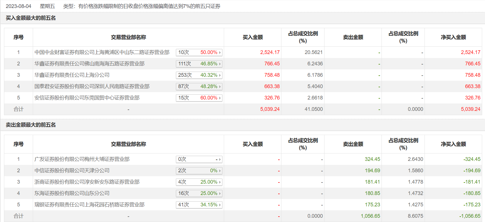 具体来看,中国中金财富证券有限公司上海黄浦区中山东二路证券营业部、华鑫证券佛山南海海五路证券营业部分别买入2524.17万元、766.45万元;广发证券梅州大埔证券营业部、中信证券天津分公司分别卖出324.45万元、194.69万元。