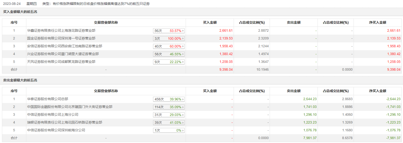 具体来看,华鑫证券上海莲花路证券营业部、国金证券深圳湾一号证券营业部分别买入2661.61万元、2139.53万元;华泰证券总部、中国国际金融北京建国门外大街证券营业部分别卖出2644.23万元、1741.03万元。