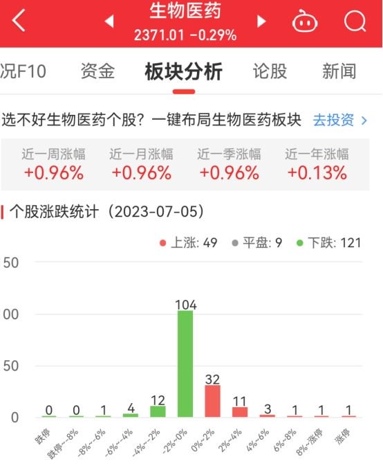 中国经济网北京7月5日讯今日,生物医药板块整体跌幅0.29%,其中49只股票上涨,9只股票平盘,121只股票下跌。