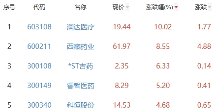 其中,润达医疗、西藏药业、*ST吉药、睿智医药、科恒股份位列板块涨幅前五位,涨幅分别为10.02%、8.55%、6.33%、5.20%、4.68%。