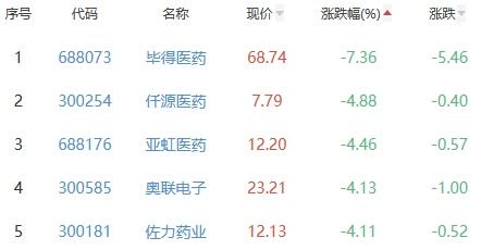 毕得医药、仟源医药、亚虹医药、奥联电子、佐力药业位列涨幅榜后五位,涨幅分别为-7.36%、-4.88%、-4.46%、-4.13%、-4.11%。