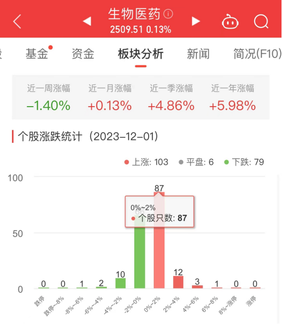 中国经济网北京12月1日讯今日,生物医药板块整体涨幅0.13%,其中103只股票上涨,6只股票平盘,79只股票下跌。