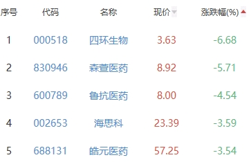 四环生物、森萱医药、鲁抗医药、海思科、皓元医药位列涨幅榜后五位,涨幅分别为-6.68%、-5.71%、-4.54%、-3.59%、-3.54%。