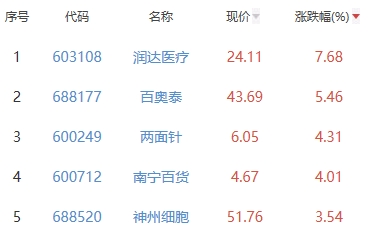 其中,润达医疗、百奥泰、两面针、南宁百货、神州细胞位列板块涨幅前五位,涨幅分别为7.68%、5.46%、4.31%、4.01%、3.54%。