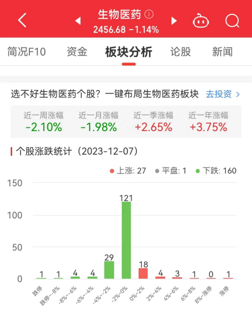 中国经济网北京12月7日讯今日,生物医药板块整体涨幅-1.14%,其中27只股票上涨,1只股票平盘,160只股票下跌。