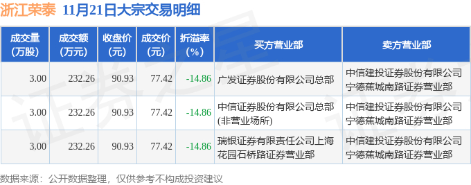 11月21日浙江荣泰现3笔折价14.86%的大宗交易 合计成交696.78万元
