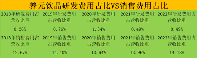 养元饮品的重心在营销上,2018年至2022年期间,养元饮品的销售费用占营收比重在12.67%-14.4%之间。同期,研发费用占营收比重在0.26%-1.34%之间。