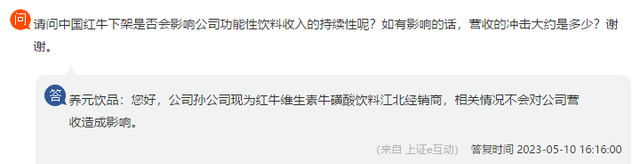 养元饮品回复道,“公司孙公司现为红牛维生素牛磺酸饮料江北经销商,相关情况不会对公司营收造成影响。”