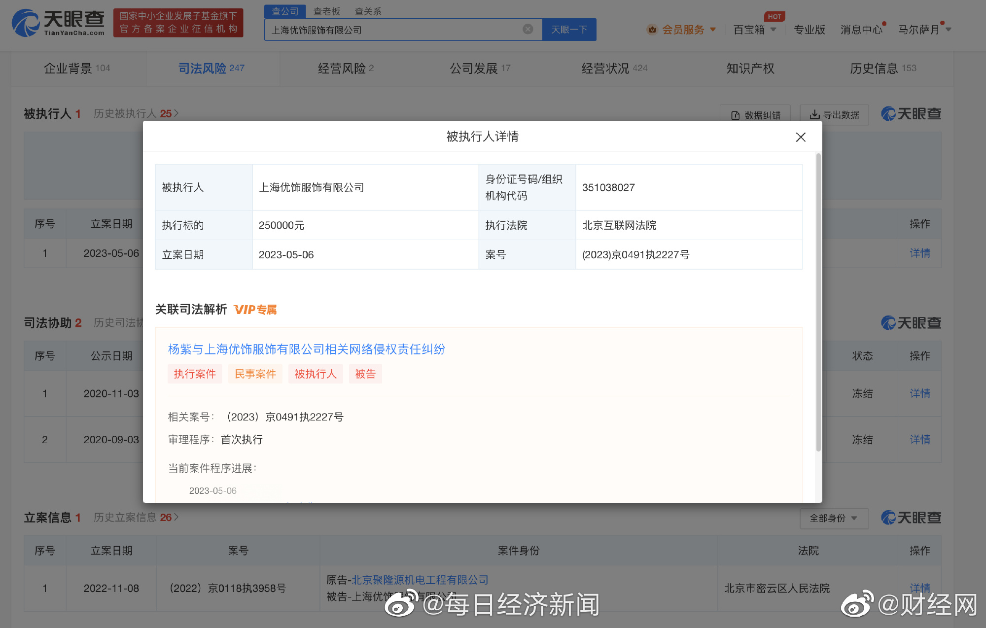 【#杨紫申请强执拉夏贝尔子公司25万元# 代言到期后该品牌仍侵权使用肖像】 天眼查App显示,近日,拉夏贝尔旗下上海优饰服饰有限公司新增一则被执行人信息,执行标的25万元,关联案件为杨紫与该公司网络侵权责任纠纷,执行法院为北京互联网法院。