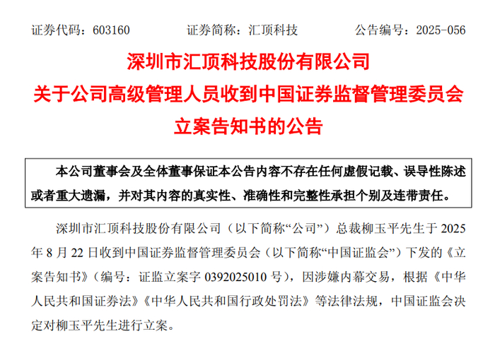 8月25日晚间,汇顶科技发布公告称,公司总裁柳玉平因涉嫌内幕交易被中国证监会立案,于8月22日收到《立案告知书》。