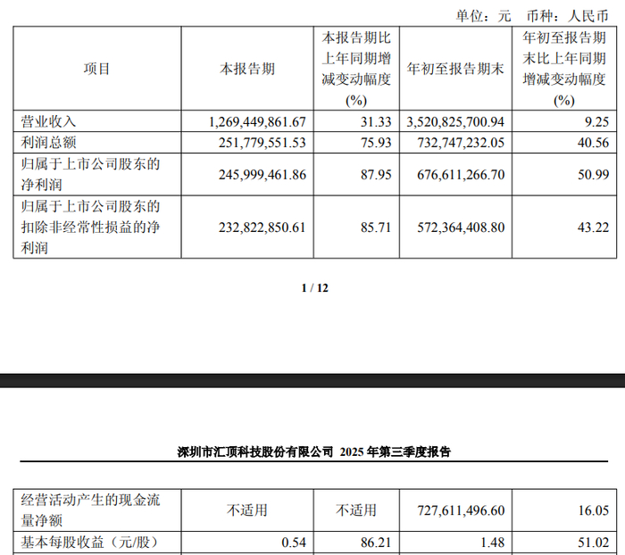 其中第三季度,汇顶科技营业收入为12.69亿元,同比增长31.33%;归母净利润为2.46亿元,同比增长87.95%;扣非归母净利润为2.33亿元,同比增长85.71%;基本每股收益0.54元。