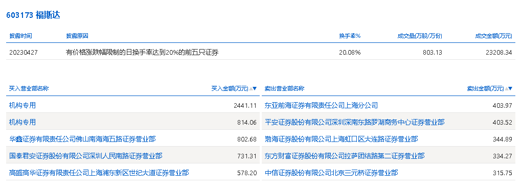 4月27日,福斯达今日涨停,龙虎榜数据显示,上榜营业部席位全天成交7169.76万元,占当日总成交金额比例为30.89%。其中,买入金额为5367.37万元,卖出金额为1802.39万元,合计净买入3564.97万元。