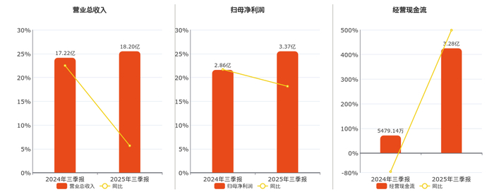 公司营业总收入为18.20亿元。归母净利润为3.37亿元。经营活动现金净流入为3.28亿元。