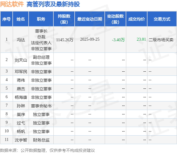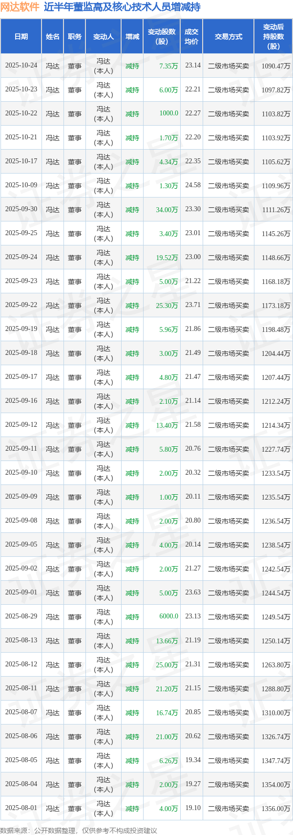 网达软件近半年内的董监高及核心技术人员增减持详情如下: