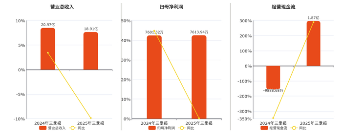 公司营业总收入为18.91亿元,较去年同报告期营业总收入减少2.07亿元,同比较去年同期下降9.87%。归母净利润为7613.94万元,在已披露的同业公司中排名第62。经营活动现金净流入为1.87亿元。