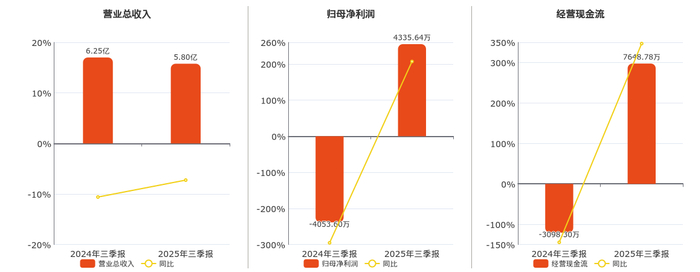公司营业总收入为5.80亿元,较去年同报告期营业总收入减少4529.42万元,同比较去年同期下降7.25%。归母净利润为4335.64万元。经营活动现金净流入为7648.78万元。
