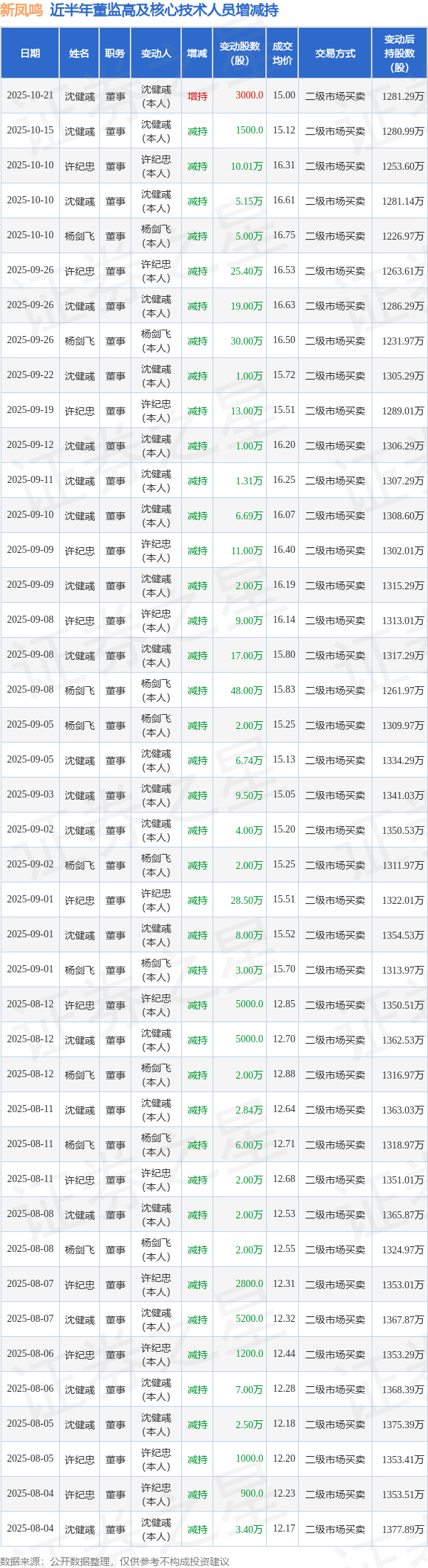 新凤鸣近半年内的董监高及核心技术人员增减持详情如下:
