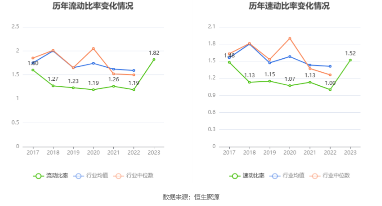 2023年,公司流动比率为1.82,速动比率为1.52。