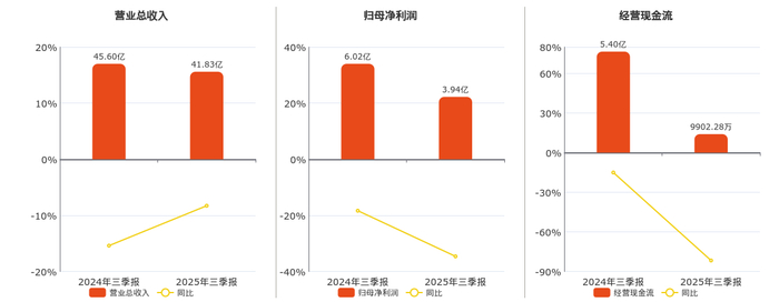 公司营业总收入为41.83亿元,较去年同报告期营业总收入减少3.78亿元,同比较去年同期下降8.28%。归母净利润为3.94亿元,较去年同报告期归母净利润减少2.08亿元,同比较去年同期下降34.60%。经营活动现金净流入为9902.28万元,较去年同报告期经营活动现金净流入减少4.41亿元,同比较去年同期下降81.65%。