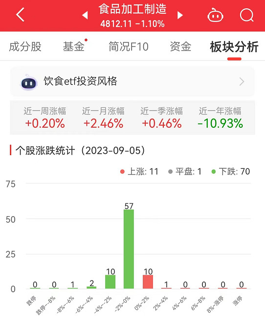 中国经济网北京9月5日讯 今日,食品加工制造板块整体跌幅1.10%,其中,11只股票上涨,1只股票平盘,70只股票下跌。
