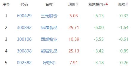 三元股份、品渥食品、西部牧业、熊猫乳品、好想你位列涨幅榜后五位,涨幅分别为-6.13%、-6.00%、-5.55%、-3.42%、-3.18%。