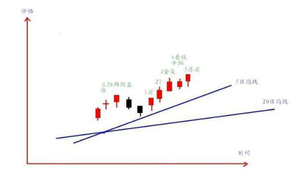 买点基准2:5日线上穿20日均线后出现先三阳后两阴(三阳必卖,两阴敢买)