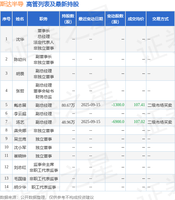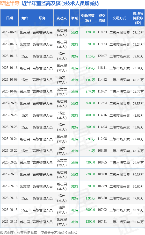 斯达半导近半年内的董监高及核心技术人员增减持详情如下: