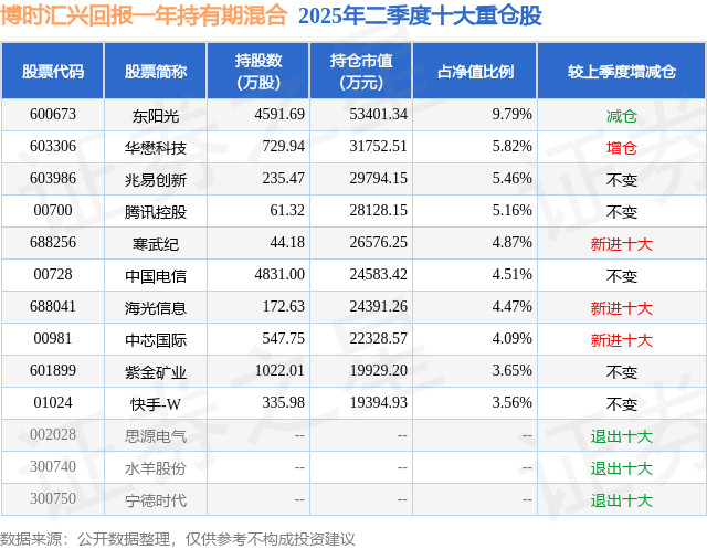 根据2025基金半年报公募基金重仓股数据,重仓该股的公募基金共19家,其中持有数量最多的公募基金为博时基金的博时汇兴回报一年持有期混合。博时汇兴回报一年持有期混合目前规模为54.55亿元,最新净值1.0486(9月29日),较上一交易日上涨2.15%,近一年上涨65.03%。该公募基金现任基金经理为吴渭。吴渭在任的基金产品包括:博时汇智回报灵活配置混合,管理时间为2017年4月12日至今,期间收益率为218.18%;博时汇荣回报混合A,管理时间为2021年8月24日至今,期间收益率为26.38%。