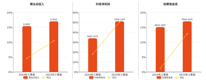 公司营业总收入为6.69亿元,在已披露的同业公司中排名第19。归母净利润为7656.26万元,在已披露的同业公司中排名第12。经营活动现金净流入为9966.69万元。