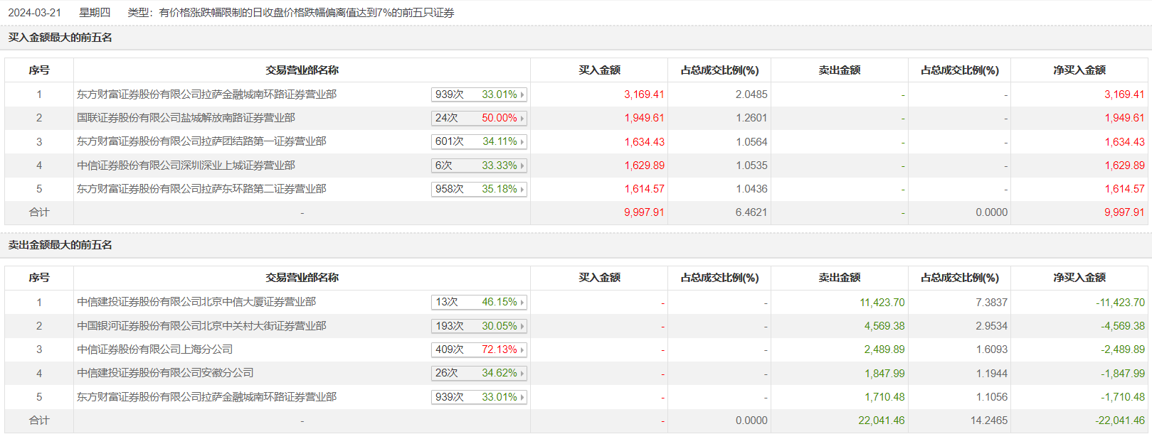 具体来看,中信建投证券北京中信大厦证券营业部、中国银河证券北京中关村大街证券营业部分别卖出1.14亿元、4569.38万元;东方财富证券拉萨金融城南环路证券营业部、国联证券盐城解放南路证券营业部分别买入3169.41万元、1949.61万元。