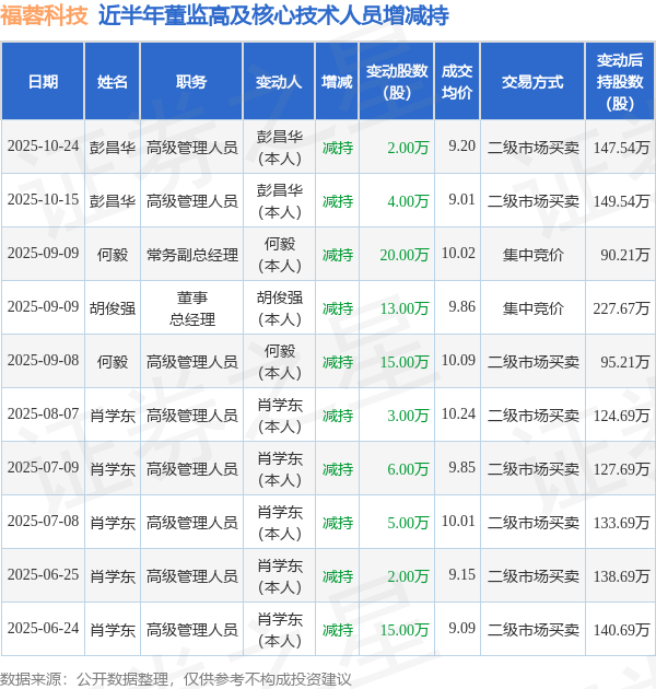 福蓉科技:10月24日高管彭昌华减持股份合计2万股