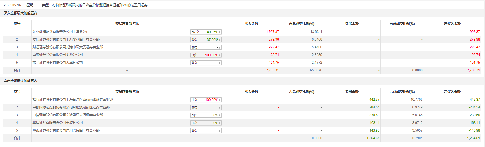 具体来看,东亚前海证券上海分公司、安信证券上海樱花路证券营业部分别买入1997.37万元、279.98万元;招商证券上海黄浦区西藏南路证券营业部、中银国际证券合肥滨湖新区证券营业部分别卖出442.37万元、284.54万元。